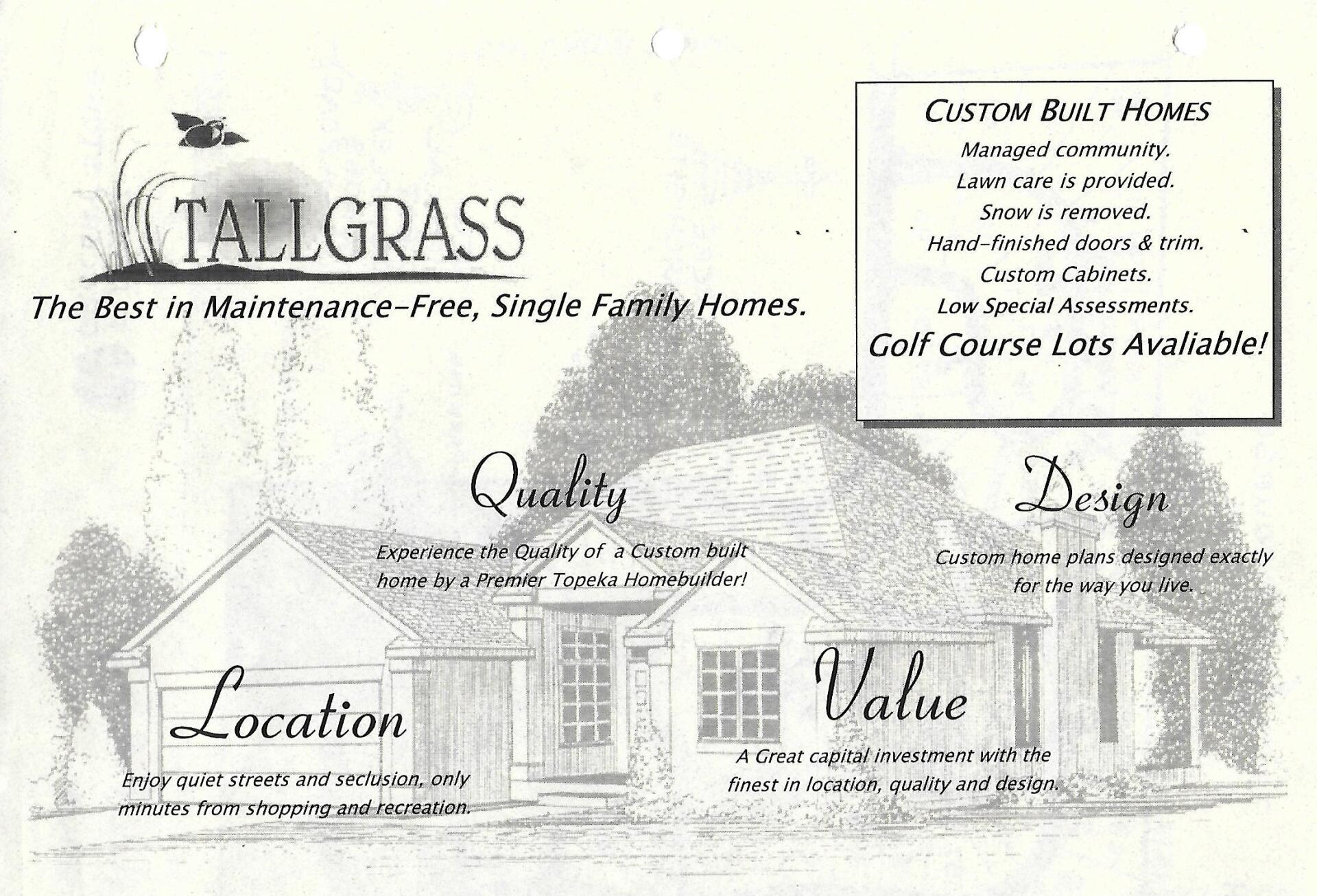 July 1, 1996 was a significant day in the history of Tallgrass Development Inc. in Topeka, Kansas. On this date the first closing took place, when Larry and Carol Shannon purchased one of two model homes. Residing at 2825 Tallgrass Drive, the Shannons were the original Tallgrass residents. A second model home at 2837 Tallgrass Drive sold shortly after the Shannon purchase.